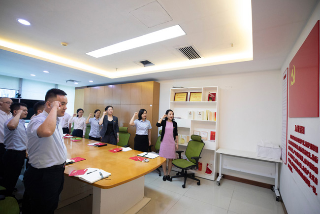 “我志愿加入中國共產(chǎn)黨……隨時準(zhǔn)備為黨和人民犧牲一切,永不叛黨。”在公司黨委委員、紀(jì)委書記廖紅梅的帶領(lǐng)下,13位公司本部黨員代表列隊肅立,高舉右拳,面對鮮紅的黨旗重溫入黨誓詞,再次莊嚴(yán)宣誓,鏗鏘誓詞,強(qiáng)烈震撼著在場每一位黨員;錚錚誓言,充分激發(fā)奮斗初心使命,升華黨員覺悟,進(jìn)一步堅定了對黨的赤膽忠心和為共產(chǎn)主義事業(yè)奮斗終身的強(qiáng)烈決心。