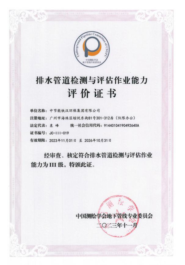 能力提升年 | 鐵漢環(huán)保榮獲排水管道檢測(cè)與評(píng)估作業(yè)能力評(píng)價(jià)證書