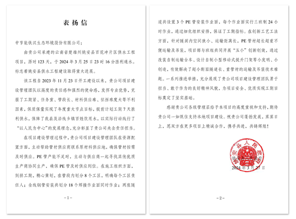 姚安縣人民政府專程發(fā)來《表揚信》,指出,項目自2023年11月23日開工建設(shè)以來,中節(jié)能鐵漢項目建設(shè)管理團隊以高度的責(zé)任感和強烈的使命感,發(fā)揮專業(yè)優(yōu)勢,克服了工期緊、任務(wù)重、管段長、材料供應(yīng)難、征拆難度大等不利因素,保質(zhì)保量實現(xiàn)了年度重大節(jié)點目標(biāo)并提前7天供水,保障了姚安縣及沿線鄉(xiāng)鎮(zhèn)百姓飲用水,對助力當(dāng)?shù)剜l(xiāng)村振興具有重要作用,以實際行動踐行了“以人民為中心”的發(fā)展理念,充分彰顯了央企責(zé)任擔(dān)當(dāng)。