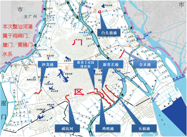 項目位于珠海市斗門區(qū),施工范圍分布在三個鎮(zhèn)區(qū),由8條河涌組成,分別為白蕉鎮(zhèn)白頭翁涌、合禾涌,井岸鎮(zhèn)五福涌、新青正涌、新青工業(yè)園排洪渠、雞咀涌,乾務(wù)鎮(zhèn)咸坑河、沙龍涌。工程主要建設(shè)內(nèi)容涵蓋河道控源截污工程、內(nèi)源清淤及底質(zhì)改良工程、面源污染控制工程、水生態(tài)凈化工程、生態(tài)景觀提升工程、改善河道水動力工程、智慧水務(wù)系統(tǒng)建設(shè)工程、應(yīng)急工程等,總治理長度21.05公里。