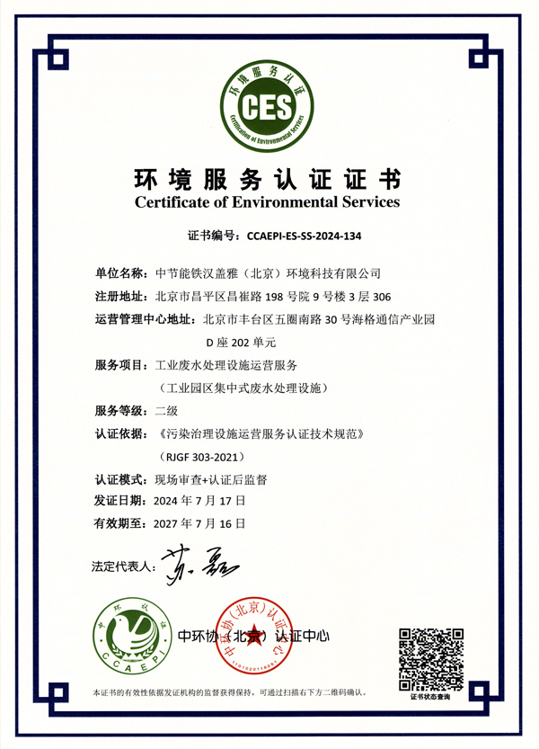 喜報 | 鐵漢蓋雅取得工業(yè)廢水處理設(shè)施運營服務(wù)二級認證證書